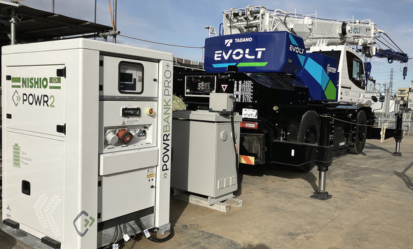 実証実験は2025年2月12日から3月7日まで実施。POWR2製の可搬型バッテリー「PRO45.90-400」(定格出力36キロワット、電池容量85.24キロワット時)を搬入し、タダノ製25トン級電動移動式クレーン「eGR-250N」への充電、給電方法を検証した。クレーンを充電のたびに移動させる必要がなく、作業休憩時の充電や可搬型バッテリーからの直接給電により、1日8時間の運転を実現した。