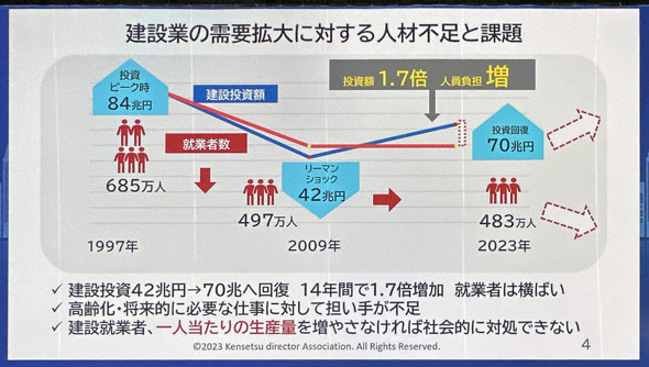 建設ディレクターは、デジタル技術を使って建設DXを実現を担う人材だ。日本で建設ディレクターが求められる背景には、21世紀に入り、建設業界の市場が様変わりしたことがある。その顕著な例が建設需要に対し、労働者が大幅に不足している状況だ。