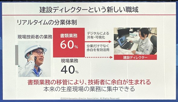 田辺氏は建設業では現場技術者の全業務中60%が書類業務なことを示し、「書類に関係する業務を建設ディレクターがリアルタイムで分業する制度を築けたら、技術者がコア業務に集中できる」と話す。