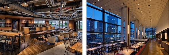 乃村工藝社は、主に南館オフィスラウンジ「sorappa」や共用部、商業エリア内の複数テナントに携わった。sorappaは、ビル4階に位置するオフィスラウンジで、カフェやワークスペース、ダイニング、テラスを備える。