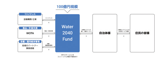 そのため、前田氏は金融機関や地域企業と連携し、「Water 2040 Fund―分散型水循環システム導入ファンド―」を創設した。財政負担の平準化に加え、WOTA独自の分析ツールを用いた計画策定や導入後の運用管理体制の構築まで、一貫した伴走型の支援を提供する。