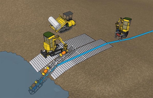 マットはロール状で不整地運搬車が運搬し、油圧ショベルが水際で展開して走行路を確保する。