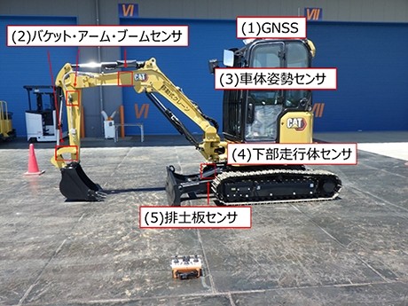 建設ロボットは熊谷組が開発したもので、遠隔操作が可能な他、さまざまな形状の物体をつかめるロータリーフォークを備える。ロボットにはGNSSやIMUセンサーを搭載し、履帯の方位角や排土板角度をリアルタイムで把握できるマシンガイダンスシステムを搭載。軟弱地盤や半水中でも、安定した走行やポンプ設置が可能になる。