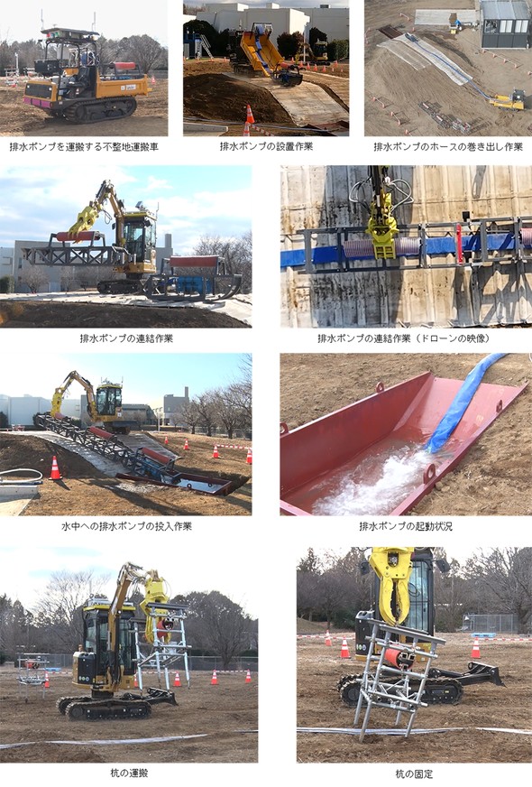 実験では、模擬環境で新たに開発した走行路補強マットの設置やポンプの運搬、ホース固定用杭の打ち込みといった一連の排水作業を無人化施工で行い、その有効性を確認した。