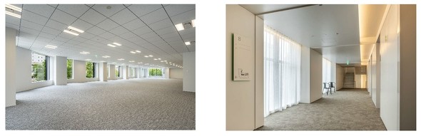 基準階は床面積約258坪、天井高さ2.8メートルの無柱空間(一部除く)を実現、OAフロア10センチを確保した。最大5分割まで対応可能で、最小賃貸面積は約21坪と多様なテナントニーズに応える。共用部には自然光を取り込む開口部を設け、屋内階段により上下階の自由な移動も可能とした。