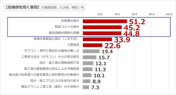 下図は、発注者(施主/オーナー)にとっての「建設工事を取り巻く危機感の要因」についての調査結果だが、建設コストの増大(労務費、材料費、物流費)への危機感は相当なもので、悲観している実情が露わになった。