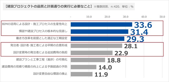 建設QCD(Quality/品質、Cost/原価、Delivery/工期))の“C”は上昇傾向が続くことは間違いないが、多少なりとも改善させるためにも“Q/D”のコントロールが重要になる。そこで「建設プロジェクトの品質と計画通りの実行に必要なこと」という質問に対しては、下図のような回答が寄せられた。
