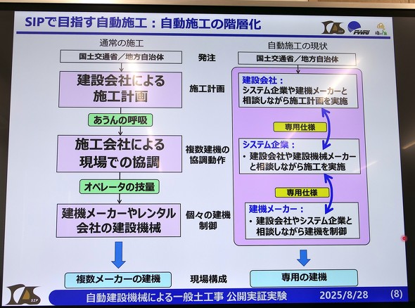 しかし、造成工事や道路工事などでは自動化は進んでいない。また、これまでの自動施工の多くは、ゼネコン、システム企業、建機メーカーがチームを組んで独自開発しているため、技術情報が外部に公開されず、自動化の普及を妨げる一因となっていた。