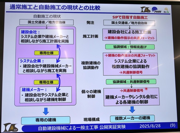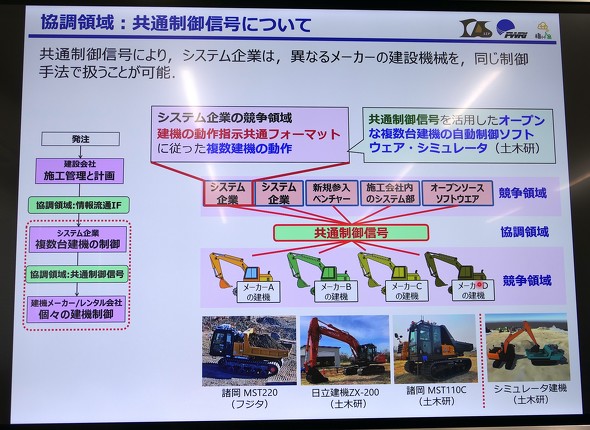 公開実験では、土木研究所が提案する開発中の「共通制御信号」も活用した。共通の制御信号に対応した建機であれば、メーカーを問わず同じシステムで制御できる。