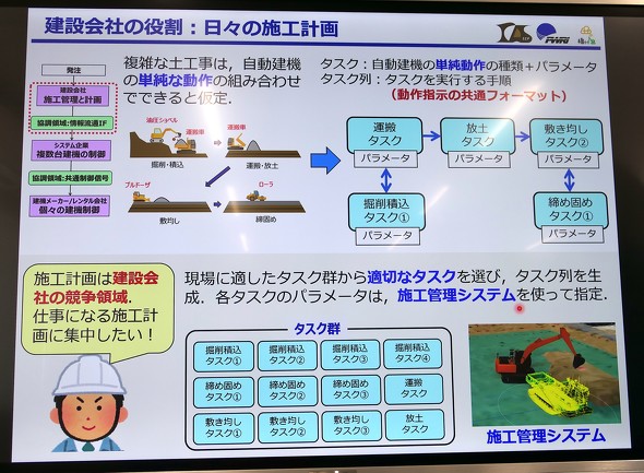共通フォーマットは、どの企業も共通で使える「協調領域」として定義されており、さまざまな企業が連携できる。監督者は、現場に適したタスク群を選んでタスク列を生成し、パラメーターを指定する。これにより、建機を制御するシステム企業は、どの監督者が作った施工計画でもそのまま実行できるようになる。建設会社は施工計画に集中でき、土工会社は施工に集中できる。「建設会社と土工会社の間をうまく埋めて橋渡しできるシステムにしたい」という。いろいろな企業の参入も可能になる。