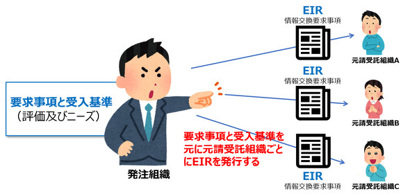 EIR(情報交換要求事項)は、発注組織が元請受託組織に発行するだけでは、プロジェクト全体の全ての関係者に浸透しない。さらに、そのまま受託組織の実務作業者に提示しても、元請受託組織自体の要求事項が入っていないので、発注組織のEIR(情報交換要求事項)を元に、元請受託組織のEIR(情報交換要求事項)を受託組織に発行しなければならない。つまり、入札段階で発注組織が元請受託組織に対して提示する「発注組織の情報要求事項(Appointing Party’s Exchange Information Requirements)」に加え、受託段階では元請受託組織が組織するその下の受託組織に対して発行する「元請受託組織の情報交換要求事項(Lead Appointed Party’s Exchange Information Requirements)」も必要となる。