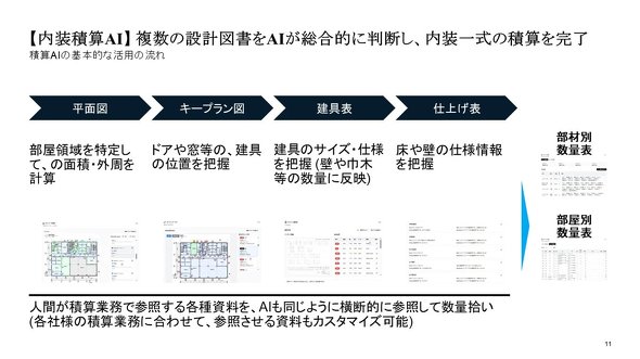 操作は図面をアップするだけで、床面積や壁長、建具の位置、巾木の長さ、仕上げ材の種別などを自動で読み取り、数量を部屋別、部材別に整理した上でExcel形式などで出力できる。読み取りはテキストや図形を統合的に認識し、企業ごとの積算業務の図面フォーマットや拾い対象、ルール、業務フローなどに合わせたカスタマイズも可能だ。対象は内装一式の他、外装、構造、設備、外構、仮設などにも対応している。