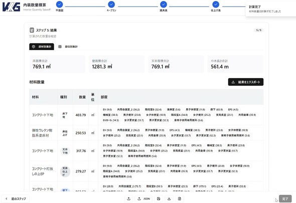 KK Generationが開発した「積算AI」は、設計図書をAIが解析して数量拾いや見積を自動化するカスタマイズ型AI SaaSだ。積算AIを活用した内装自動積算では、複数の設計図書(平面図、キープラン図、建具表、仕上げ表など)を横断的にAIエージェントが解析し、部屋別/部材別の数量を自動で集計する。