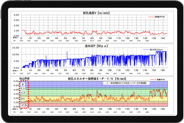 また、ボーリング結果から独自算定するエネルギー指標値に基づき、断層破砕帯や亀裂集中帯、風化変質帯などの脆弱性を正確に把握。削孔時に削孔深度や削孔速度、送水圧、フィード圧、地山等級などがリアルタイムで確認でき、自動削孔においても不良地山が判断できる。