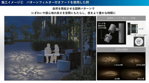 灯具の外に取り付けるフードオプションは、グレアを低減する「スラッシュフード」と、地面に木漏れ日や水玉など4パターンの図柄を投影する「パターンフィルター付きフード」を用意。図柄を地面に映して来街者を楽しませる賑わいの創出など、より幅広い使い道が見込める。