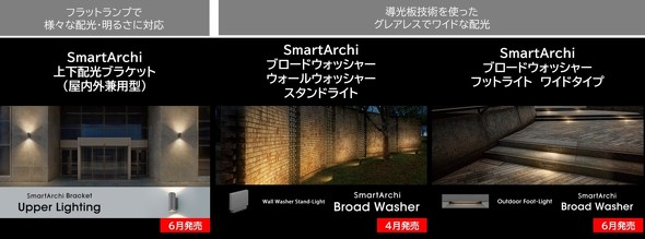 SmartArchiの製品群はいずれも、輝度で考える照明設計に重点を置き、ソフトとハード両方の視点から照明の性能を追求している。エクステリア製品としては、2025年に入って、壁面を美しく均一に照射する「SmartArchiブロードウォッシャー ウォールウォッシャー スタンドライト」、壁面に取り付けて上下方向を同時に照らす「SmartArchi上下配光ブラケット(屋内外兼用型)」、ローグレア&超ワイド配光の壁に埋め込むフットライト「SmartArchiブロードウォッシャー フットライト ワイドタイプ」を順次リリース。多様な照明アプローチで、ナイトタイムエコノミーの快適性や情緒的な豊かさといった新たな価値観を提供している。