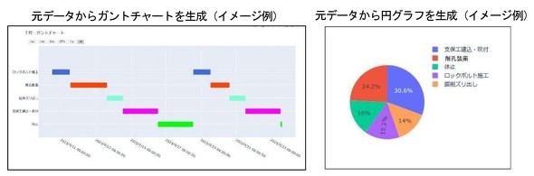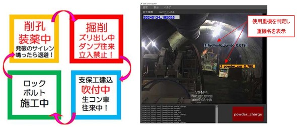 新開発のシステムは「作業別ガントチャート自動作成システム」と「切羽危険エリア侵入 自動警報発報システム」の2種類。現場に設置したWebカメラの映像をAIがリアルタイムで解析し、遠隔から現場状況を把握できる。
