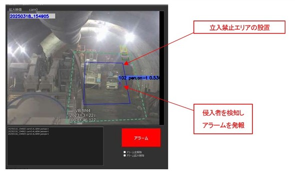 「切羽危険エリア侵入 自動警報発報システム」は、映像内の作業員の動きをAIが解析し、危険エリアへの侵入を即時に検知。警報を発することでヒューマンエラーによる事故を未然に防止する。危険エリアは遠隔から任意に設定でき、柔軟で行動な安全管理を実現する。