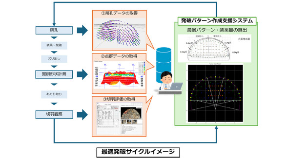 新システムは、削孔データや点群データ、AIによる切羽評価データを組み合わせ、各発破区間ごとに最適な抵抗線長と装薬量を自動で算出する。