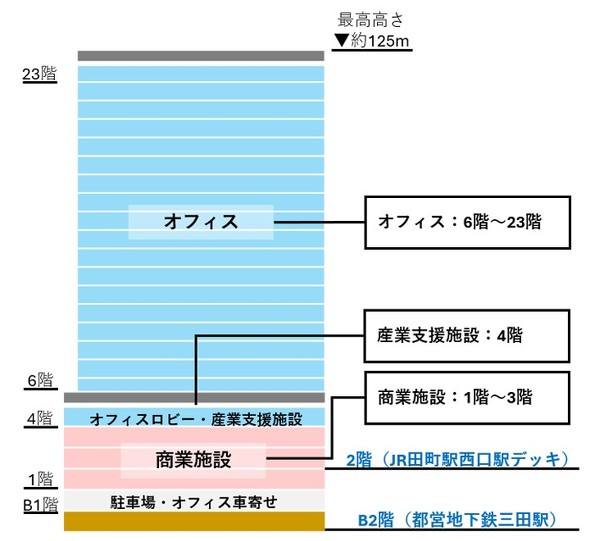 田町駅西口デッキと都営地下鉄「三田」駅の地下通路に直結する立地に、オフィス、商業施設、産業支援施設を備えたミクストユース型の開発プロジェクトで、敷地面積は約6615平方メートル、延べ床面積は約9万8570平方メートル。基本設計・実施設計・監理・施工は鹿島建設が担当する。