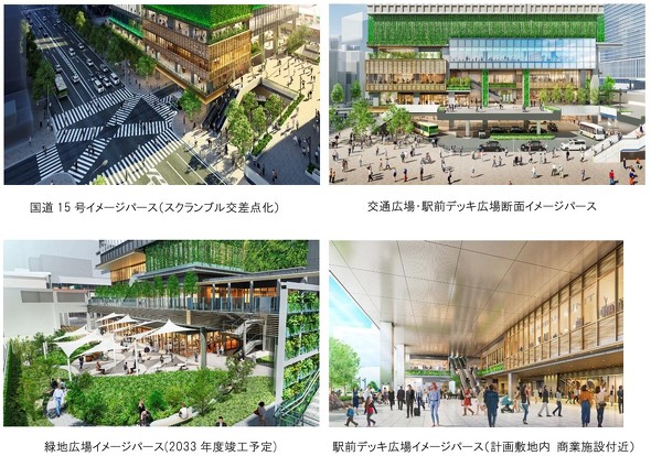 今回の開発では、駅と街が一体となった基盤整備を行う。地上レベルでは交通広場を現状の約1200平方メートルから約3000平方メートルへ拡張し、歩道の拡幅やタクシー乗降場の引き込みを実施して歩行者ネットワークの改善を図る。国道15号沿いの交差点はスクランブル化して安全性を高める。2階レベルでは、田町駅構内の東西自由通路を拡幅し、駅前デッキ広場を約2000平方メートル規模に拡張。三田駅と接続する新たなバリアフリー動線も整備する。2033年度には敷地内に緑地広場を整備し、地域住民やワーカーの憩いの場として開放する予定だ。