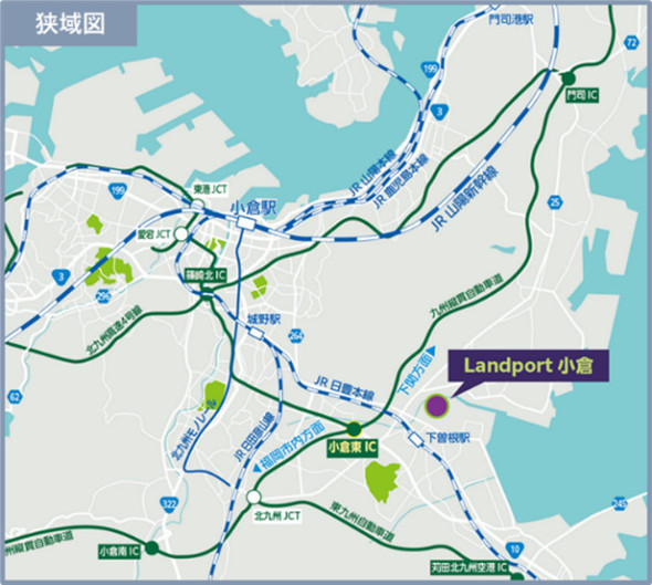 建設地は、九州自動車道「小倉東IC」/北九州都市高速「長野IC」まで約2.8キロに位置し、九州全域や中国地方西部への広域配送にも対応。北九州空港まで約15分、新門司港まで約20分、太刀浦コンテナターミナルまで約30分と、陸/海/空のインフラへのアクセスが良好だ。