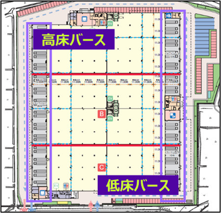 多様な車両や荷物に対応するため、低床と高床のハイブリッド両面バースを採用し、効率的なオペレーションの構築が可能。マルチテナント型施設として3分割貸しにも対応する。敷地内一方通行の車両動線で搬出入車両の安全性に配慮する他、コンテナ車対応の待機スペースを設け大型車両にも対応する。施設内には利用者向けのカフェテリアも設ける。