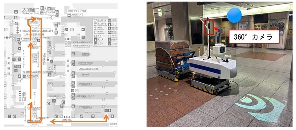 実証実験では、ロボットは事前に設定したルートを、荷物台車をけん引して走行する。走行には係員が付き添う。周囲の状況を確認するため、ロボットに搭載した360度カメラで撮影実施。また、ロボット走行時の人の流れを評価するため、天井に設置した複数の3D LiDARセンサーにより点群データを取得する。