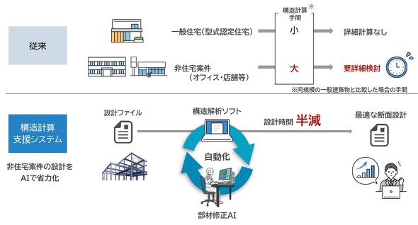 トヨタホームは主力の鉄骨ユニット工法による戸建住宅の新築請負事業に加え、社員寮や店舗、医療/介護施設などの非住宅分野でも事業を拡大している。戸建住宅では型式適合認定を受けており、専門技術者による詳細な構造計算を省略できるが、非住宅案件では毎回詳細な構造計算が必要で、対応の遅れが受注機会の損失につながるという課題があった。