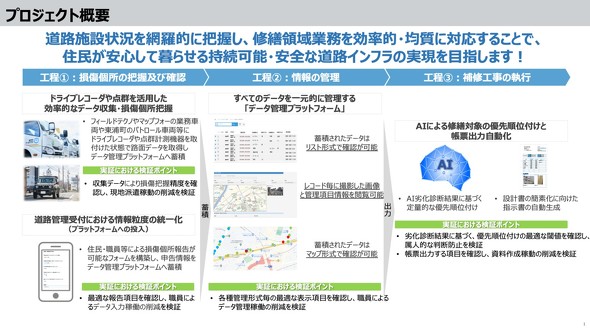 マップフォーとNTTフィールドテクノは、愛知県東浦町と共同で、AIを用いた画像/LiDAR解析技術を活用して、道路の損傷把握や修繕業務の高度化を目指す実証事業に取り組む。