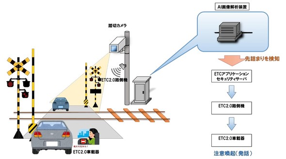 名古屋鉄道など5者は、愛知県半田市でAI画像解析とETC2.0を活用した踏切注意喚起システムの実証実験を行う。AI画像解析により踏切先の道路混雑を検知し、ETC2.0車載器を搭載した一般車両が踏切へ進入しようとした際に「踏切の先詰まりに注意してください」といった音声で注意を呼び掛ける。