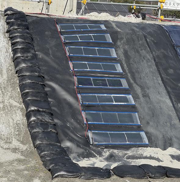マクニカは2025年12月18日、遮水シートと一体化したペロブスカイト太陽電池(PSC)を大林組と共同開発し、奥村組技術研究所内に造成した試験用盛土斜面での実証試験を開始したと発表した。