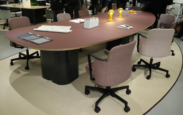 今回、多様な働き方に合わせてテーブルワークを発展させるため、「Commons Table System-i(コモンズテーブルシステム アイ)」に新モデルを追加。カーブデザインの天板を持つ大型テーブルと、足元にゆとりを持たせるインセット構造のコア脚を組み合わせ、広いテーブル空間で自由な位置に座れるようにした。多人数のディスカッションから少人数の打ち合わせまで柔軟に使える点が特徴だ。少人数用サイズや半円形天板モデルも展開する。