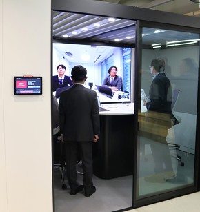 今回のフェアでは2種類のCo-at boxのスタイルを提案。ソファスタイルのブースでは資料と映像を分けて表示できる2画面構成により、落ち着いた雰囲気の中で意見を交わせるリラックス感を演出。スタンディングスタイルのブースでは、4K高解像度映像と発言者の位置に合わせて音声が立体的に出力され、直接対面しているようなリアルな会話体験を実現し、立ったまま濃密に打ち合わせするシーンを再現した。