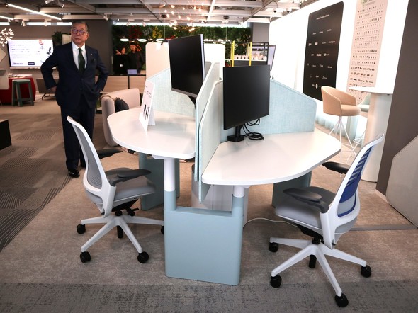 米Steelcase(スチールケース)との協業から誕生したチームデスク「Co-Creation(コ クリエーション)」シリーズでは、3人で効率よく使える120度天板の「Co-Creation 120°」と、天板の回転機能で集中が必要な個人ワークとチームワークを簡単に切り替えられる4人用「Co-Creation Pivot(ピボット)を展示。いずれも電動昇降に対応し、座位、立位など姿勢を変えながら使用できる。