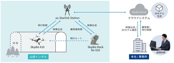 KDDI、KDDIスマートドローン、清水建設は2026年2月9日、衛星通信「Starlink」を用いたauエリア構築ソリューション「au Starlink Station」と自動離着陸/充電機能を備えたドローンポート「Skydio Dock for X10」を活用し、山岳トンネル坑内の遠隔巡回実証に成功したと発表した。