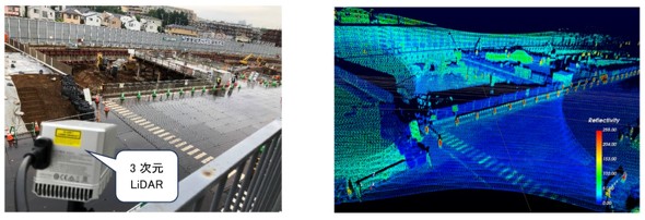 新システムは複数の3D LiDARを併用することで、仮設物による死角を相互に補完し、土留壁全面を24時間連続的かつ非接触で監視する。変状監視の初期値を点群で設定するため、3Dモデルや座標の事前準備が不要になる。また、LiDARの変状検出精度向上に向けては、法政大学との共同研究成果を応用している。