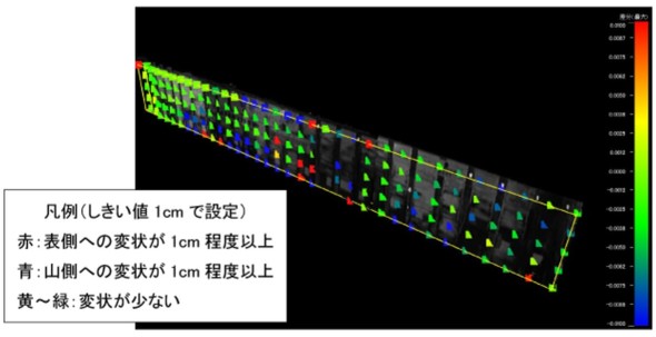 土留壁の変状は従来、変位計や切梁反力などのセンサーや巡視により監視している。しかしリアルタイムで監視できるセンサーは点的な検知に限られ、面的な確認ができる巡視は1日に数度程度にとどまる。崩壊や大きな変状を防ぐにはセンサーの増設や巡視頻度の増加などが求められる。