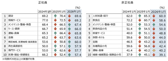 その他、低賃金や不規則な労働環境などが要因で慢性的に人手が不足している「メンテナンス/警備/検査」で前年同月比0.9ポイント増の67.4%、公共工事減少などの影響を受けて建設業者からの発注が減る「リース/賃貸」で同0.1ポイント増の66.0%など、51業種中7業種が6割を上回った。