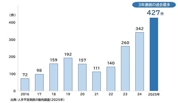 2025年に発生した人手不足倒産は427件と、3年連続で過去最多を更新し、初めて年間で400件を超えた。建設業や物流業、老人福祉事業など労働集約型の業種で増加が目立つ。