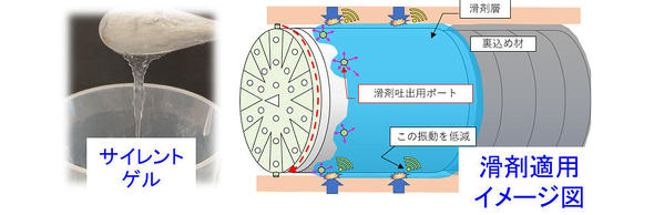 サイレントゲルの適用により、マシン外殻と地山の間で生じる周辺摩擦によってマシンが静止と滑りを交互に繰り返すスティックスリップ現象を抑制できる。室内模擬実験では従来品と比べ振動加速度を約50%低減する性能を確認した。実施工現場でも振動加速度レベルを7dB低減するなど、周辺摩擦低減と振動抑制の効果を確認している。