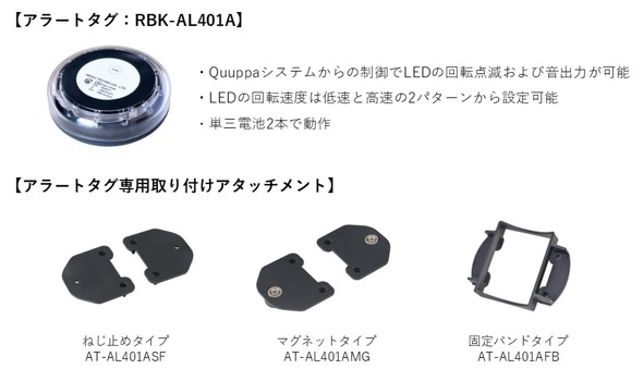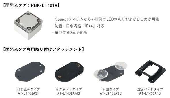 併せて、アラート通知に対応する新型タグ2種と取り付けアタッチメント7種をラインアップし、2026年4月1日から受注を開始する。Quuppaの双方向通信の特徴を生かし、サーバ側からの指示で現場への直接アラート通知が可能になった。新型タグとアップデート版「Patt Plus」は既に大手製造業の現場で試験導入されており、作業者の危険エリア侵入判定やクレーンとの接近検知、体調不良検知などの用途で効果測定を実施。安全管理対策や労働環境の改善で高い評価を得たという。
