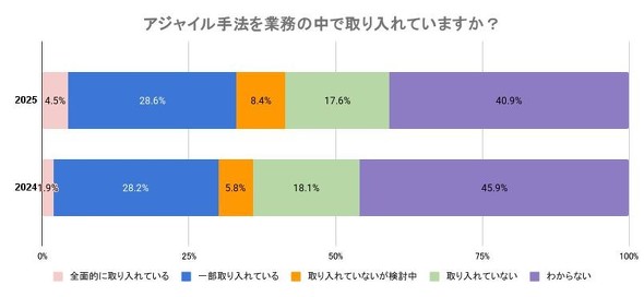 業務での導入状況を見ると、アジャイル手法を「全面的に取り入れている」「一部取り入れている」の合計が33.1%となった。特に「全面的に取り入れている」と回答した企業は、1.9%から4.5%へ2.4倍に増加。建設業界でも内製化やスピード感のあるシステム改善の必要性が高まる中で、アジャイル開発が重要な役割を担い始めつつあり、一部企業ではDXの取り組みが実行段階から、定着段階に移りつつあることもうかがえる。