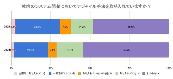 調査結果をみると、アジャイルという思想や手法を「知っている」と回答した企業は54.8%となった。2024年調査時の49.6%から5.2ポイント上昇し、過半数に達した。