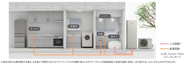 16機種のうち、JXシリーズ4機種はマイクロバブルを活用した「美泡湯eco」を追加。「酸素美泡湯」とエコキュートの「eco」と組み合わせた名称で、ポンプで加圧した湯に溶解タンクで空気を溶け込ませ「ふろ接続アダプター」で減圧することでマイクロバブルを発生させる仕組みだ。浴槽の湯をマイクロバブルで白濁させ、潤いや入浴後のぬくもりを持続させる。