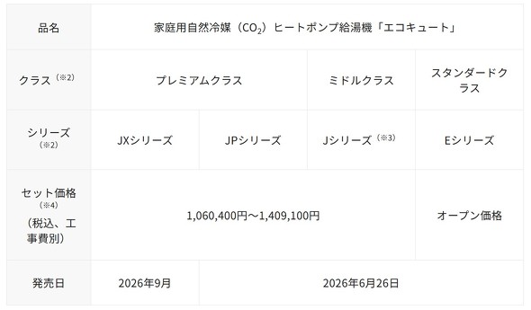 パナソニック 空質空調社は、家庭用ヒートポンプ給湯器「エコキュート」全7シリーズ53機種をフルモデルチェンジし、2026年6月26日から順次発売する。ウルトラファインバブル搭載機種を追加し、清掃性や温浴効果を付加することで個人のQOL向上につなげる。