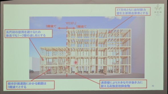 施工を担う安藤建設は横浜市で1942年に創業し、神奈川県内を中心に公共/民間の新築/改修工事を幅広く手掛けてきた。安藤建設 笠原史隆氏は「ここ数年、当社でも大型木造の施工機会が増加している」と説明。一方で、大型木造建築はS造やRC造を組み合わせたハイブリッド構造が多いことに触れ「当社でも以前から純木造ビル建築を模索してきたが、技術的な問題などから実現には至っていなかった。今回の敷地との出会いとエヌ・シー・エヌとの連携により、事例の少ない純木造5階建てビルへの挑戦が実現した」と振り返る。「木造ビルを珍しい選択肢ではなく、新しいスタンダードにしたい。同業他社と連携しながら建物の木造化を盛り上げていければと考えている。今後は6階、7階、8階建てを実現できるプロジェクトも視野に入れ、中高層の大型木造の推進に協力していく」と決意を述べた。