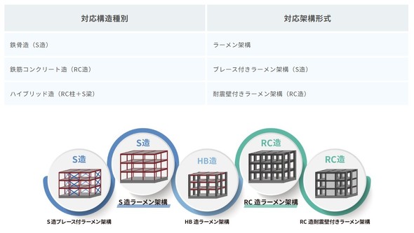 対応する構造種別は、S造、RC造、ハイブリッド造(RC柱+S梁)で、対応する架構形式は、ラーメン架構、ブレース付きラーメン架構(S造)、耐震壁付きラーメン架構(RC造)。構造種別や架構形式の比較検討を迅速かつ柔軟に進められ、コストパフォーマンスに優れた設計提案につなげる。