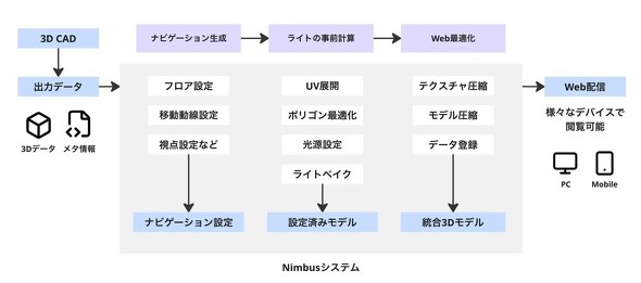 従来は技術者が手作業で対応していたVR化工程を、CADメタデータの解析によってシステム化した。独自システム「Nimbus(ニンバス)」により、制作工程の自律化と省人化を進める。制作工程から人の作業を排除したことで人的ボトルネックを解消し、クラウドでの並列構築を可能にした。スループットを大幅に向上させ、全国展開規模の全棟VR化に対応する。